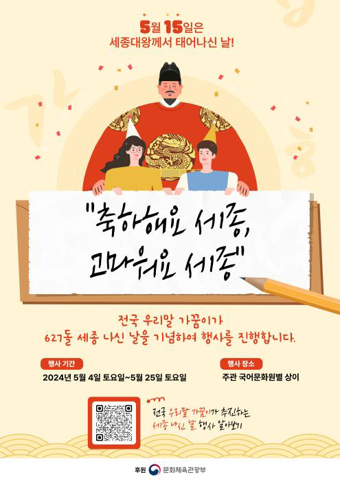 문화체육관광부는 5월 한 달간 전국에서 국립국어원, 전국 국어문화원, ‘우리말가꿈이’ 등과 함께 다채로운 국어 관련 행사를 열어 '세종대왕 나신 날'을 기념한다. 먼저 국립국어원은 네이버와 업무협약을 맺고 13~26일 네이버 누리집과 국립국어원 누리집 및 유튜브 채널 등을 통해 '슬기로운 우리말 생활-도전, 외국어를 바꿔라!' 캠페인을 진행한다. 이번 캠페인에서는 우리말의 소중함과 아름다움을 느낄 기회를 제공하기 위해 일상생활에서 경험하는 외국어·외래어를 우리말로 다듬는 활동을 담은 짧은 영상을 공모하고, 우수한 작품을 선정해 소정의 선물을 증정한다. 전국 국어문화원은 대학, 지자체 등과 협업해 다양한 기념행사를 개최한다. 강원대, 목포대, 영남대, 인하대, 전남대 국어문화원은 대학 캠퍼스에서 각종 체험 행사와 한글 퀴즈, 한글 주제 강연, 말하기 대회, 우리말 겨루기 대회 등을 진행한다. 한남대 국어문화원은 지자체와 협업해 지역아동센터에서 아동을 대상으로 한글 교육을 진행한다. 고려대 세종, 세종 국어문화원은 세종시 '한글사랑 거리' 등에서 한글사랑 기념식과 공연, 전시, 체험 행사, 특별 토론회 등을 추진한다. 전주대 국어문화원은 지역의 아름다움을 한글로 표현하는 '전북특별자치도의 아름다운 풍경' 디지털사진과 시 공모전을 개최한다. 한양대 국어문화원은 온라인에서 한국어와 한글 사용에 이바지한 '우리 동네 세종대왕' 공모전을 진행하고 한글문화연대는 온라인 누리소통망을 활용해 우리말 퀴즈 행사를 개최한다 전국 13개 지역에서 대학생 등으로 구성, 활동하고 있는 '우리말 가꿈이' 470여 명도 세종대왕과 한글을 기념하는 활동을 펼친다. '세종대왕 나신 날'을 맞아 대학 캠퍼스와 지역 도서관 등에서 퀴즈 대회, 캠페인, 공모전, 우리말 다듬기와 교구 만들기 등 다양한 체험 활동을 기획해 진행한다. /이성재 기자