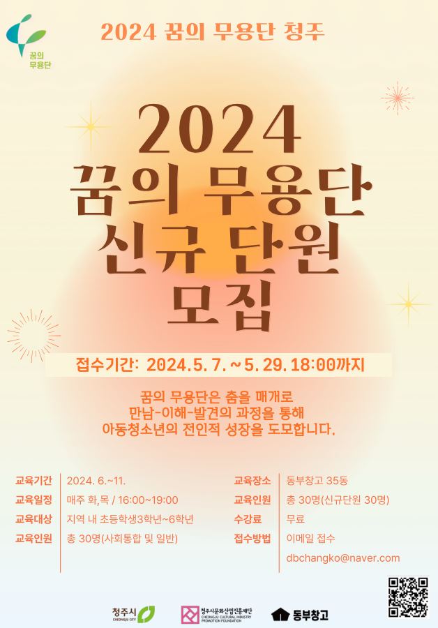 청주시문화산업진흥재단(이하 청주문화재단)이 '꿈의 무용단' 첫 단원을 모집한다. 2024년 청주문화재단이 신규 거점기관으로 선정된 본 사업은 문화체육관광부가 주최하고 한국문화예술교육진흥원이 주관하는 국비지원 문화예술교육사업이다. 아동·청소년들이 ‘몸’을 통해 자신만의 서사를 담은 춤을 만들고, 지역사회와 나누는 과정을 경험함으로써 올바른 가치관을 형성하고 미래 역량을 키워가는 것을 목표로 한다. 청주의 첫 '꿈의 무용단'은 올 한해 각자가 만들어 낸 춤을 하나의 작품(레퍼토리)로 개발하여 선보일 예정으로, 지원 자격은 춤에 관심 있는 청주시 소재 초등학교 3학년부터 6학년까지다. 일반 및 사회통합계층 학생 총 30명을 모집하며, 교육비는 전액 무료다. 최종 단원은 인터뷰를 통해 선발하며 무용에 대한 관심과 경험, 활동의지 등을 검토한다. 단원으로 선발되면 오는 6월 발대식을 시작으로 11월까지 매주 화·목요일 16시부터 19시까지, 동부창고 35동 아르코공연연습센터@청주에서 총 36회 교육을 받는다. 현대무용, 한국무용 및 K-POP을 기반으로 몸과 춤을 통해 내면을 성장하는 기회를 얻게 된다. 특별공연과 정기공연도 진행하며 간식과 연습복, 무대의상 등 공연을 위한 준비사항은 모두 제공한다. 청주라는 큰 무대에서 '춤'으로 마음껏 꿈을 펼쳐나갈 '꿈의 무용단 청주' 와 함께하고 싶은 초등학생은 청주문화재단 또는 동부창고 홈페이지에서 신청서를 내려 받아 작성한 후, 29일 18시까지 이메일(dbchangko@naver.com) 제출하면 된다. /이영준 기자 이영준 기자 lyj@sejongilbo.co.kr 다른기사 보기 저작권자 © 세종일보 무단전재 및 재배포 금지 당신만 안 본 뉴스 한화 불꽃축제 30일 개최…대전시, 방문객 안전 관리 강화 주민이 채우는 폐교, 지역이 키우는 공간으로 만든다 [사설] 일할 세대가 떠난다 ‘APEC 2025 미래들의 수다’, 청년 시선으로 본 인구위기 어린이 환경교육, 뮤지컬로 배우는 탄소중립 외로움 대신 연결로… 청년 위한 온라인 상담 시범 운영 반복되는 SPC 사고… 노동부 "노동강도·건강영향 재진단 필요" 한화 불꽃축제 30일 개최…대전시, 방문객 안전 관리 강화 개의 댓글 회원로그인 작성자 비밀번호 댓글 내용입력 댓글 정렬 최신순 추천순 답글순 BEST댓글 BEST 댓글 답글과 추천수를 합산하여 자동으로 노출됩니다. 닫기 더보기 댓글삭제 삭제한 댓글은 다시 복구할 수 없습니다. 그래도 삭제하시겠습니까? 비밀번호 닫기 댓글수정 댓글 수정은 작성 후 1분내에만 가능합니다. 본문 / 400 비밀번호 닫기 내 댓글 모음 닫기 주요기사