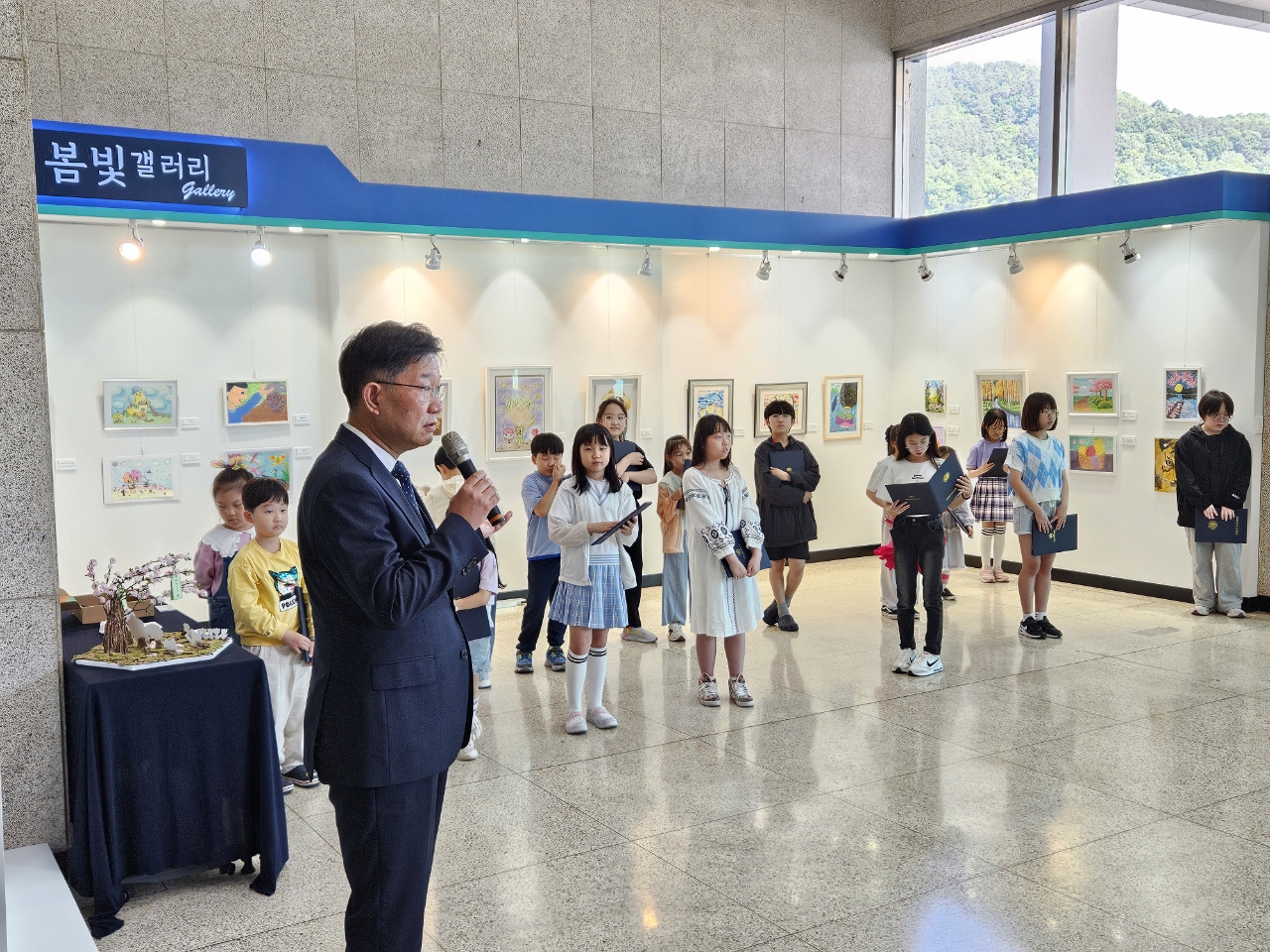 대전동부교육지원청은 17일 '봄빛 갤러리'에서 어린이 미술 특별 전시에 출품한 학생 가족 45명을 초대하여 두 번째 개막식을 개최했다. 동부교육지원청은 어린이날 및 가정의 달을 기념해 '눈이 부시게 푸른, 우리들 세상'이라는 주제로 어린이 미술 특별 전시를 열고 있다. 동부 관내 초등학생들이 창작한 작품을 교체 전시하고 있으며, 이번 회차 전시는 7개 학교, 학생 28명 이 참여했다. 이번 개막식에는 최재모 교육장이 참석하여 어린이 작가 임명장을 수여하고, 어린이들의 꿈과 도전을 응원하는 격려사를 했다. 이어 전시에 출품한 학생들이 학부모님과 또래 어린이들에게 그림에 담긴 다양한 이야기와 느낌 등을 설명하면서 자유롭게 감상을 나눴다. 한편 동부교육지원청은 가정의 달을 맞이하여 주말과 공휴일에도 청사 '봄빛 갤러리'를 개방해 가족 단위로 예술문화를 향유하고 가정 화목을 다질 수 있도록 하고 있다. 실제 행사를 주관한 중등교육과는 공휴일에도 가족과 함께 갤러리를 방문하고 방명록에 긍정적 소감을 남긴 가족들이 많다고 밝혔다. 최재모 대전동부교육장은 "예술교육은 창의성과 인성을 키우는 뿌리가 되는 교육"이라며 "앞으로 지역사회와 연계하여 학교 예술교육의 외연을 확장하고 나갈 것이다"라고 말했다. /이성재 기자