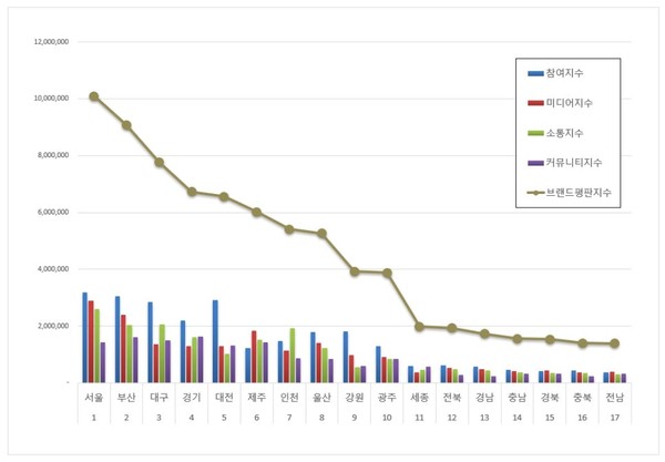 한국기업평판연구소가 대한민국 광역자치단체 브랜드평판 2024년 5월 빅데이터를 분석한 결과 17개 도시의 순위가 발표됐다. 한국기업평판연구소는 2024년 4월 28일부터 2024년 5월 28일까지의 대한민국 광역자치단체 17개 브랜드 빅데이터 7억627만2669개를 분석했는데 지난달 동기 6만624만4342개와 비교하면 15.14% 증가했다. 대전 브랜드는 참여지수 292만216, 미디어지수 129만2766, 소통지수 103만2839, 커뮤니티지수 131만7328으로 브랜드평판지수 656만3149로 분석됐다. 17개 브랜드 중 5위다. 뒤를 이은 세종은 참여지수 58만6875, 미디어지수 37만599, 소통지수 45만8214, 커뮤니티지수 46만5646, 브랜드평판지수 198만1334으로 11위다. 충남은 14위다. 참여지수 46만6668, 미디어지수 41만3646, 소통지수 36만815, 커뮤니티지수 32만2072으로 브랜드평판지수는 156만3201이다. 충북은 꼴등을 겨우 면했다. 참여지수 44만9, 미디어지수 38만978, 소통지수 33만7983, 커뮤니티지수 24만4204로 브랜드지수 140만3175, 16위다. 충청권 광역자치단체 중 대전시는 3월부터 3개월동안 3위, 7위, 5위를 기록했다.충북은 3월부터 5월까지 12위, 15위, 16위로 꾸준히 순위가 떨어졌다. 충남은 9위, 16위, 14위로 하위권을 기록중이다. 세종 또한 16위, 11위, 11위로 하위에 머물고 있다. 대전을 제외한 충북과 충남, 세종의 브랜드평판지수가 꾸준히 중·하위권에 머무르고 있다는 의미다. 한편 대전시는 전국 85개 도시를 조사하는 한국기업평판연구소 2024년 5월 대한민국 도시 브랜드평판 빅데이터 분석결과 전국 3위를 차지하기도 했다.