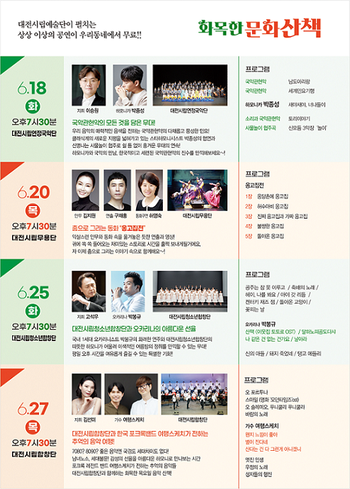 대전시립예술단은 18일부터 시민을 위한 '화목한 문화 산책'공연을 연다. 6월 공연은 18일, 20일, 25일, 27일 오후 7시 30분 대전 동구청 12층 공연장에서 진행된다. 2014년 '우리 동네 문화 가꾸기'로 시작해 올해 11년째 접어든 '화목한 문화산책'은 시민들의 문화 향유와 도심 활성화에 기여하며 많은 사랑을 받고 있는 공연으로, 지난 4월 대덕구에서 진행한 올 첫 번째 공연도 객석을 가득 메우며 성황리에 마무리했다. 6월 공연 첫날인 18일에는 시립연정국악단의 무대가 펼쳐진다. 이승훤 예술감독의 지휘 아래 박종성의 하모니카 연주와 신명 나는 사물놀이 협주로 '세계민요기행','새야새야', '너나들이','토리이야기','신모듬 3악장' 등 쉴 틈 없이 흥겨운 무대가 이어질 예정이다. 20일에는 시립무용단에서 어린이들로부터 많은 인기를 얻고 있는 춤으로 그리는 동화‘옹고집전’공연을 준비했다. 언제나 전석 매진의 신화를 쓰고 있는 공연으로 익살스러운 안무와 동화 속을 옮겨놓은 듯한 무대와 영상 그리고 아이들의 귀에 쏙쏙 들어오는 재미있는 동화구연으로 어린이들에게 꿈과 희망을 안겨줄 예정이다. 25일에는 시립청소년합창단이 고석우 지휘자의 지휘로 '공주는 잠 못 이루고', '축배의 노래', '켄터키 재즈 잼' 등 익숙한 노래들의 따뜻한 하모니를 만나볼 수 있다. 또 오카리니스트 박봉규의 협연으로 '이웃집 토토로 OST' , '나 같은 건 없는 건가요' 등의 아름다운 선율이 펼쳐진다. 27일에는 시립합창단과 한국 포크록밴드 여행스케치가 전하는 추억의 음악 여행이 준비되어 있다. '오 솔레미오', '푸니쿨리 푸니쿨라' 등 우리 귀에 익숙한 합창음악과 함께 포크록밴드 여행스케치가 '왠지 느낌이 좋아', '별이 진다네', '산다는 건 다 그런 게 아니겠니' 등의 노래를 선보인다. 공연은 선착순 입장이며 전석 무료로 관람할 수 있다. 자세한 내용은 대전시립예술단 홈페이지와 예술단 공연사업지원국으로 문의하면 된다. /이영준 기자