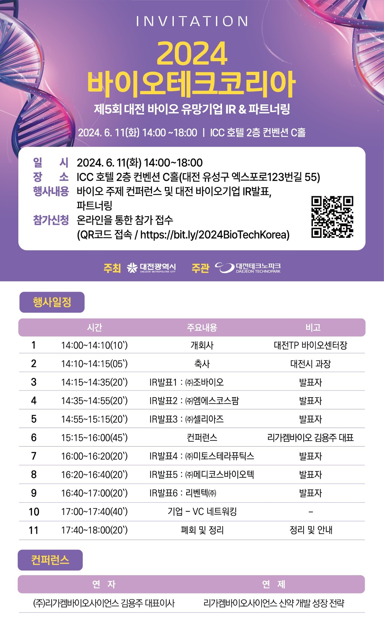 대전시는 11일 호텔 ICC에서 지역 유망 바이오 기업과 함께 '제5회 바이오테크코리아'행사를 개최했다. 지난해 11월 4회차 행사에 이어 다섯 번째로 열린 이날 행사는 대전지역 초기 투자 단계 바이오 기업들의 민간 투자 유치 활성화를 위해 마련됐다. 대전시가 주최하고 대전테크노파크가 주관한 이번 행사는 기업이 보유한 주요 사업화 기술에 대한 발표와 벤처투자자와 기업 간 개별 투자 면담, 바이오 주제 콘퍼런스 등으로 진행됐다. 발표에 참여한 기업은 △(주)조바이오 △(주)엠에스코스팜 △(주)셀리아즈 △(주)미토스테라퓨틱스 △(주)메디코스바이오텍 △리벤텍(주) 등 6개 사이다. 대덕벤처파트너스, 미래과학기술지주, KB인베스트먼트, 데일리파트너스 등 다수의 바이오 전문 벤처투자 관계자들은 참여 기업에 적극적인 관심을 보였으며, 투자 유치 확대를 위한 전문 컨설팅도 제공했다. 또한 최근 레고켐바이오사이언스에서 ㈜리가켐바이오사이언스로 사명을 바꾸고 신약 개발에 박차를 가하는 김용주 대표의 콘퍼런스도 진행됐다. 리가켐바이오사이언스는 항체-약물접합체(ADC) 플랫폼 기술을 앞세워 누적 8조 원을 넘어서는 기술수출 성과를 달성한 대전의 대표 바이오 기업으로, 행사에 참여한 바이오산업 관계자를 비롯하여 신약 개발기업과 투자자들의 이목이 쏠렸다. 대전시는 10월에 제6회 바이오테크코리아를 개최할 예정으로 지역 기업들이 투자 유치를 확대하고 사업을 성장시킬 수 있도록 관련 IR 행사를 지속해서 마련한다는 계획이다. 한편 대전시는 지난달 29일 머크 아시아태평양 공정시설 착공으로 대전의 바이오산업 생태계도 활기를 띨 것으로 예상하고 있다. 대전시는 머크를 지역의 앵커기업으로 삼아 머크의 기술, 자금력, 글로벌 네트워크를 활용해 바이오기업 지원, 투자 유치, 글로벌 판로개척과 상호협력을 위한 네트워킹을 확대해 나갈 계획이다. /이영준 기자