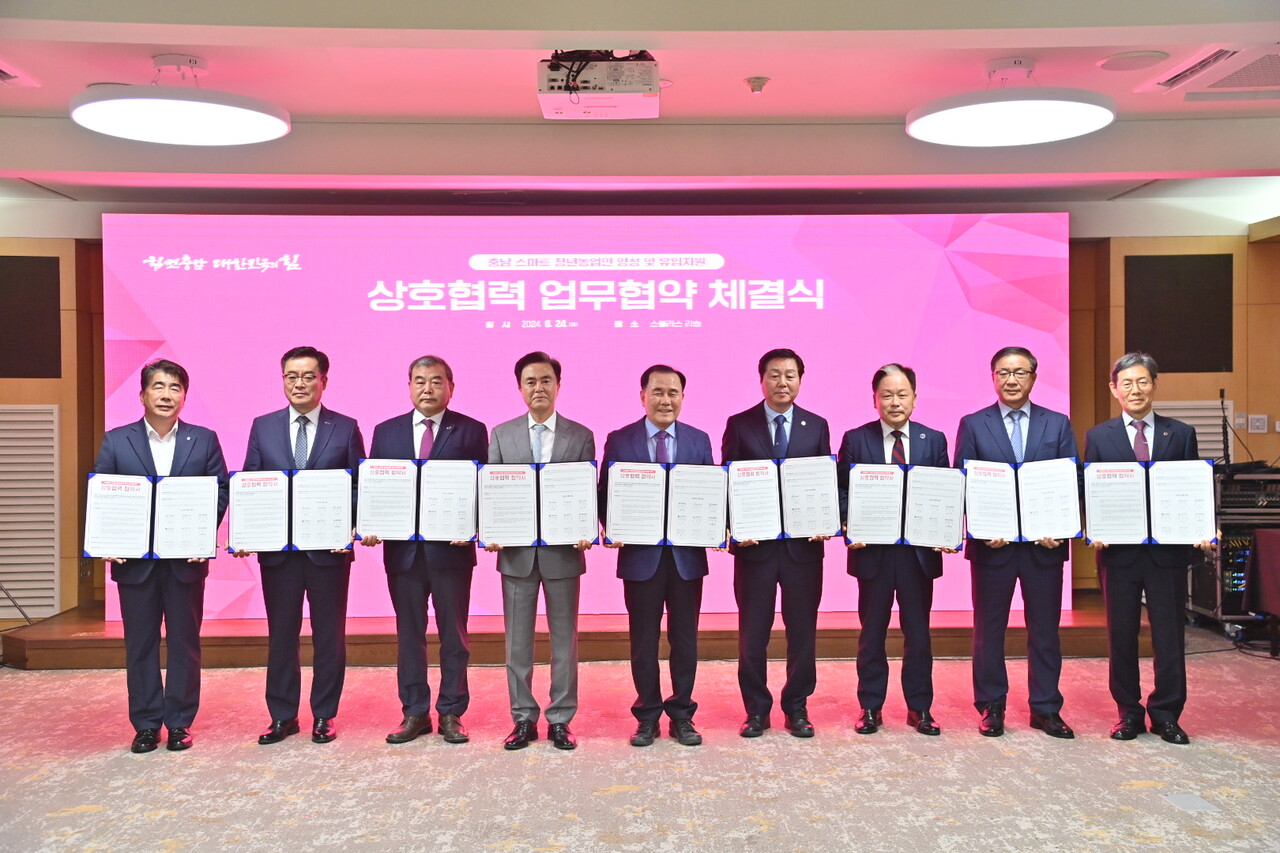 충남도가 도내 스마트팜 창농에 도전하는 청년농업인의 안정적인 정착을 지원하기 위해 관계기관·대학과 손을 맞잡았다. 도는 24일 스플라스리솜에서 도교육청, 총남대, 국립공주대, 연암대, 도립대, 농림수산식품교육문화정보원, 한국농업기술진흥원, 농협중앙회 충남세종본부와 ‘충남 스마트 청년농업인 양성 및 유입 지원 상호협력 업무협약’을 체결했다. 김태흠 지사와 김지철 도교육감, 김정겸 충남대 총장, 임경호 국립공주대 총장, 육근열 연암대 총장, 김용찬 도립대 총장, 이종순 농림수산식품교육문화정보원장, 안호근 한국농업기술진흥원장, 백남성 농협중앙회 충남세종본부장 등 50여 명이 참석한 가운데 이번 협약식은 영상 시청, 추진 배경 및 협약 내용 설명, 협약 서명 등의 순으로 진행했다. 이번 협약으로 각 기관은 청년농 육성 및 안정 정착을 위한 스마트팜 기반을 마련하고 도내 청년농 유입이 활발해질 수 있도록 교육부터 창농까지 전 과정에 힘을 모으기로 했다. 협약 주요 내용은 △인재 육성을 위한 첨단 기술 교육 강화 △농업계 고교 졸업생 진로 탐색 지원 △스마트팜 창농 교육과정 공동 개발 및 컨설팅 △청년농업인 정책·사업 공유 △청년농업인 정착 지원 확대 등이다. 특히 농업계 고교·대학 졸업생의 지역 정주, 유입을 촉진하고 스마트팜 도전을 활성화할 수 있도록 정책사업과 연계 협력할 계획이다. 아울러 도는 스마트팜 청년 인재 양성을 위해 하반기 6개 대학과 2차 협약을 맺고 교육·정착 연계를 통한 청년농 유입을 확대할 예정이다. 이 자리에서 김 지사는 "도는 '스마트팜 청년창업의 고속도로'를 놓을 것"이라며 "도와 각 기관이 만들어 갈 '풀코스 커리큘럼'이 정예청년농을 양성하고, 스마트팜을 통해 농업의 판도를 바꿀 것"이라고 말했다. 이어 김 지사는 "구글, 아마존 등 최고의 기업들이 앞다퉈 농업시장으로 들어가고 있고 전 세계가 미래먹거리 산업을 농업에서 찾고 있다. 인공지능(AI), 로봇 등 최첨단 기술을 접목해 거대한 농업시장을 만들어 낼 스마트팜이 우리가 나아갈 길"이라면서 "네덜란드 같은 세계적 농업 강국들과 어깨를 나란히 할 날까지 모든 노력을 쏟아부을 것"이라고 강조했다. 한편 도는 스마트팜 확대와 청년농업인 육성을 위해 금융·시공·경영설계 등 단계별 지원체계 구축, 충남글로벌홀티콤플렉스 조성 추진 등 스마트팜 창농의 중심지로 거듭나기 위해 다양한 정책을 펴고 있다. /이성재 기자