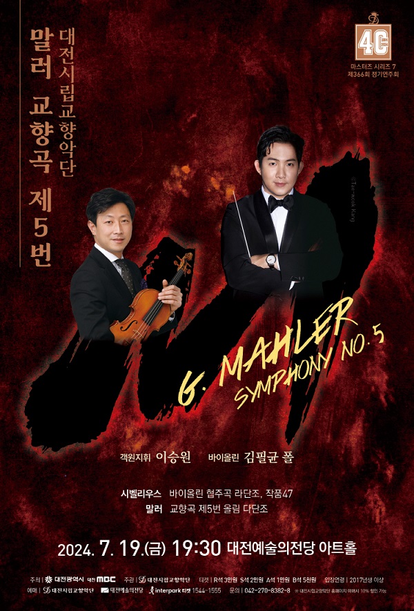 오는 19일 저녁 7시 30분 대전예술의전당 아트홀에서 대전시립교향악단의 마스터즈시리즈 7이 열린다. 이번 연주회에서는 말러 교향곡 제5번이 연주될 예정으로 많은 클래식 음악 애호가들의 기대를 모으고 있다. 연주회는 시벨리우스의 바이올린 협주곡으로 시작된다. 이 곡은 대전시립교향악단 악장인 김필균 폴 바이올리니스트의 협연으로 더욱 빛날 예정이다. 김필균 폴은 뛰어난 연주 실력과 리더십을 갖춘 음악가로, 이번 공연에서 그의 탁월한 기량을 유감없이 발휘할 것이다. 이어지는 2부에서는 말러의 교향곡 제5번이 연주된다. 이번 공연의 지휘는 2024년 덴마크 말코 국제 지휘 콩쿠르에서 우승한 이승원 지휘자가 맡는다. 이승원 지휘자는 섬세하고 강렬한 지휘로 주목받고 있으며, 그의 말러 해석은 특히 기대를 모으고 있다. 말러의 대표작 중 하나인 교향곡 제5번은 그 웅장함과 감동적인 선율로 많은 이들에게 사랑받는 작품으로, 이번 공연에서도 깊은 인상을 남길 것이다. 이번 연주회의 예매는 대전시립교향악단 홈페이지, 대전예술의전당 홈페이지, 그리고 인터파크를 통해 가능하다. /이성재 기자