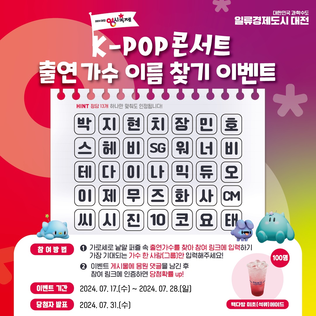 대전시는 8월 9일부터 열리는 '2024 대전 0시 축제'의 대표 프로그램인 K-POP 콘서트 출연 뮤지션 중, 시민들이 가장 보고 싶은 가수를 알아보는 SNS 이벤트를 진행한다. 이 이벤트는 7월 17일부터 28일까지 진행되며, 참여 방법은 가로세로 낱말 퍼즐 속에 숨겨진 여러 출연 가수의 이름 중 좋아하는 가수 한 명을 찾아 28일까지 SNS 게시글의 참여 링크를 통해 이름을 적으면 된다. 참여자 중 추첨을 통해 선정된 100명에게는 음료 기프티콘을 경품으로 지급한다. 이벤트와 관련된 자세한 사항은 대전 0시 축제 홈페이지나 대전시 SNS 게시글을 참고하면 된다. 노기수 대전시 문화예술관광국장은 “이번 0시 축제는 TV 화면을 통해서만 접해왔던 댄스·발라드·힙합·트로트 등 다양한 장르의 정상급 뮤지션을 직접 만나볼 수 있는 기회가 될 것”이라며 “K-POP 콘서트뿐만 아니라 대전이 가진 재미와 매력을 만끽할 수 있는 다양한 프로그램이 준비되어 있는 만큼 대전 0시 축제에 시민 여러분의 많은 관심과 참여를 당부드린다”라고 말했다. 한편, 대전 0시 축제는 오는 8월 9일부터 17일까지 9일간, 대전역에서 옛 충남도청 구간 1km 도로를 통제하고 중앙로와 원도심 상권 일원에서 개최된다. /이영준 기자